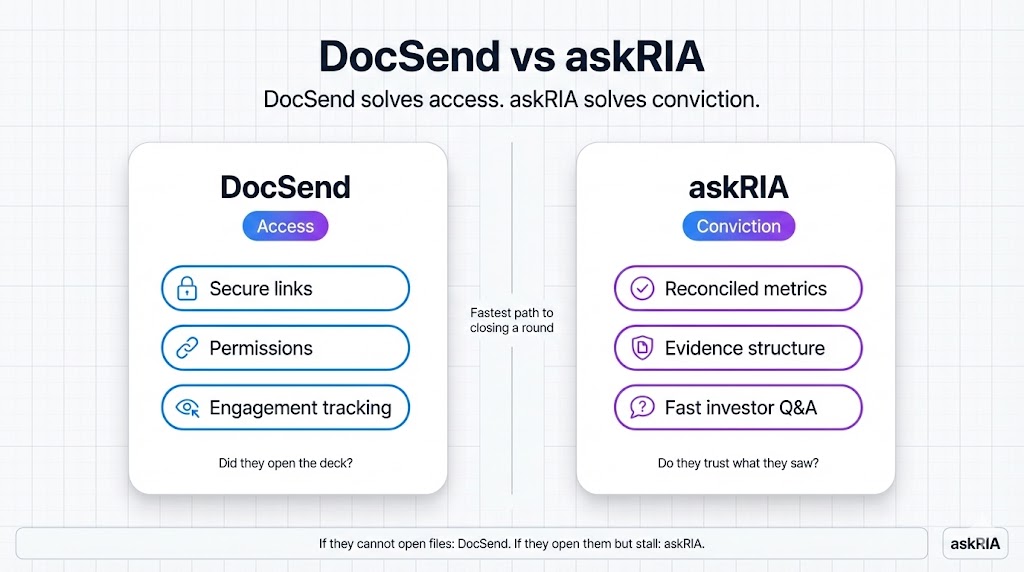 Use DocSend for secure sharing and engagement tracking. Use askRIA when investors stall during diligence because metrics, evidence, and answers are messy. DocSend solves for access. askRIA solves for conviction.